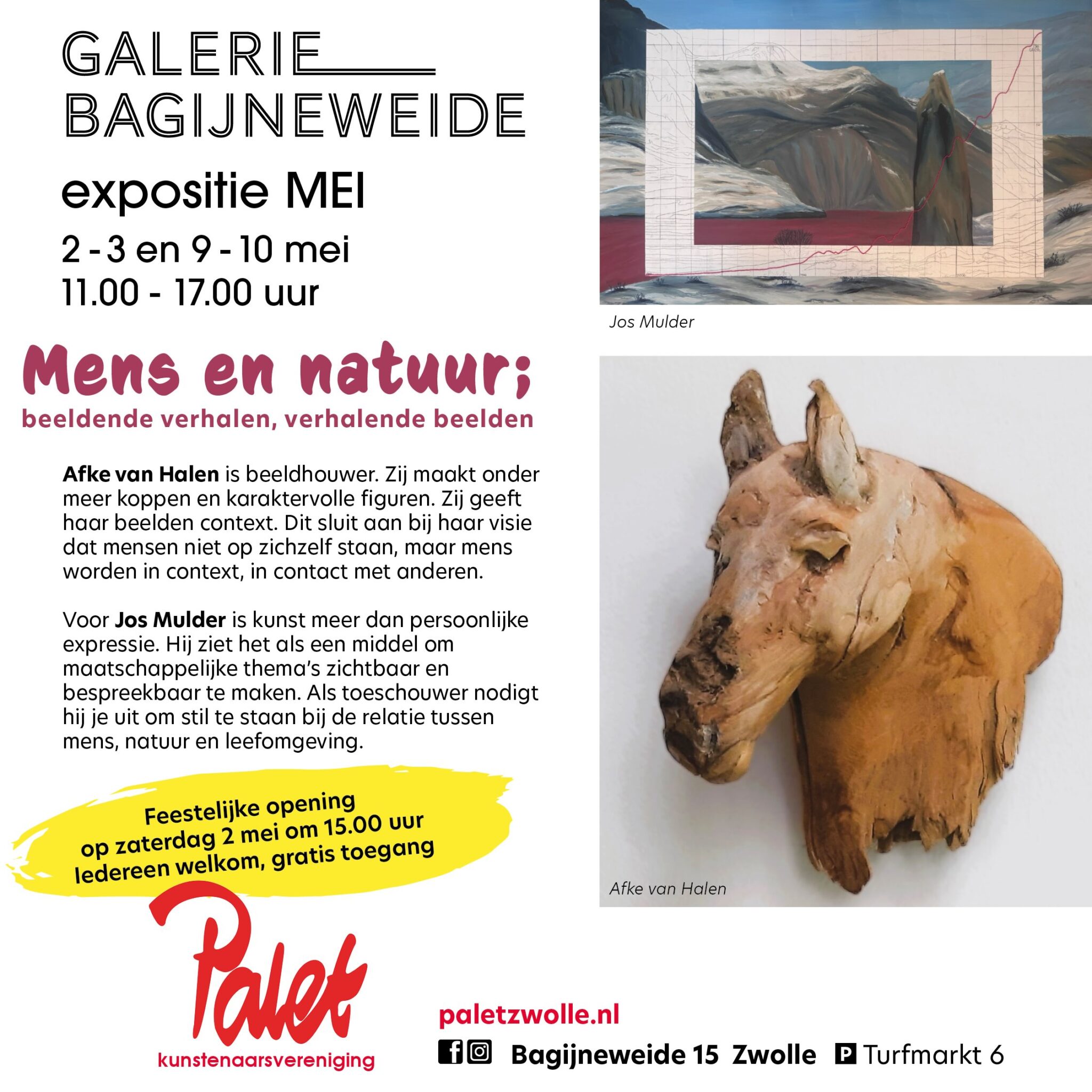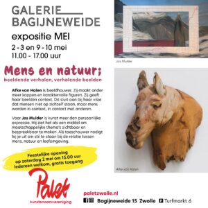 Op 2 mei wordt de tentoonstelling ‘Mens en natuur // beeldende verhalen, verhalende beelden’ feestelijk geopend in Galerie Bagijneweide in Zwolle. De expositie is gedurende twee weekenden (2&3 en 9&10 mei) gratis te bezoeken, van 11:00 tot 17:00 uur, bij Palet aan de Bagijneweide 15. De officiële opening is op zaterdag 2 mei om 15.00 uur.