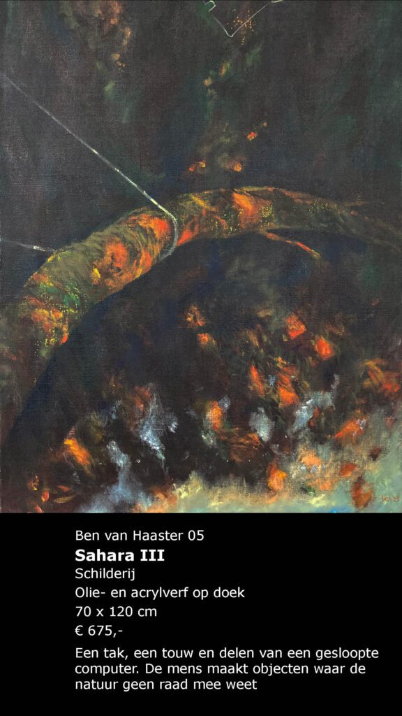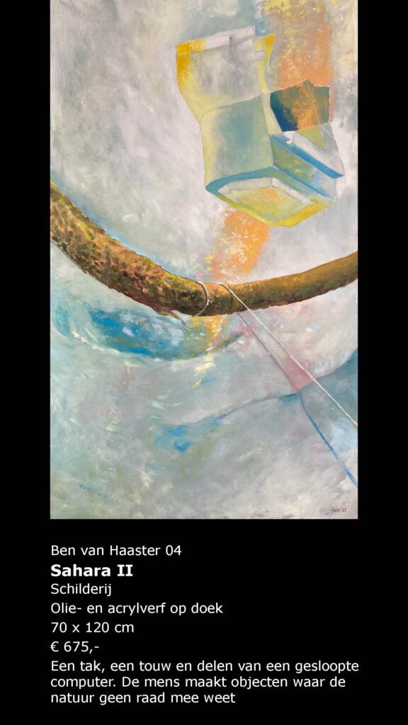 Mijn werk kun je kenmerken met het woord ‘variatie’. In onderwerpen, materiaalkeuzes, technieken en formaten. Landschappen en stillevens vind ik fijn om te doen, maar vervreemdend en hopelijk sterk beeld creëren houdt me ook bezig.
