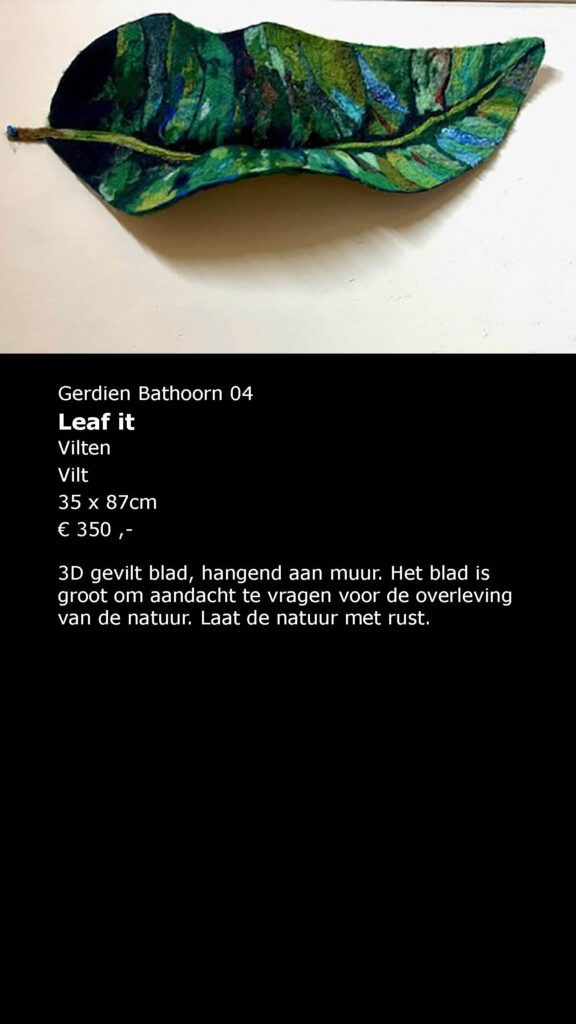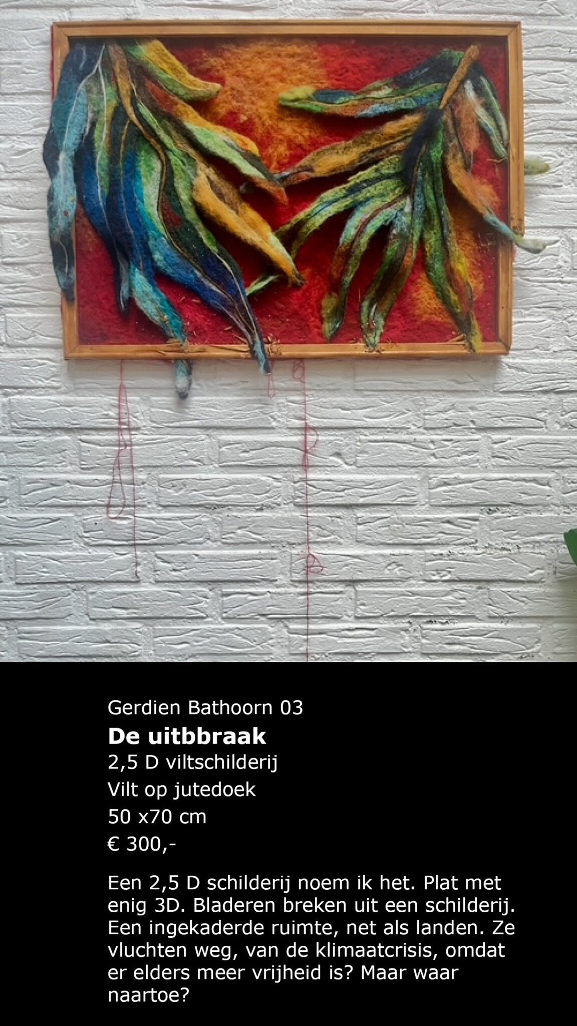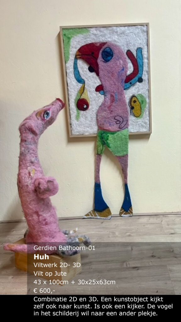 Van huis uit schilder ik en ik vind het vooral leuk objecten te maken en te beschilderen. Ik beperk me niet graag. Ik werk met verschillende materialen zoals hout, keramiek, verf, vilt en de ipad. Ik experimenteer graag, het liefst altijd anders. Ik haal mijn inspiratie uit de dode natuur (stenen, skeletten, boomstronken e.d.), strandjutten, musea, galeries, op straat en mijn kindertijd. Ik werk ook graag met kleur. Dat staat voor mij voor optimisme en beweging. Ik bewonder velen o.a. Betty Woodman (keramist), Picasso, Gerard ’t Hart, Banksy e.d. Ik probeer met mijn werk vooral een eigen wereld te creëren waar ik mij lekker in voel.
