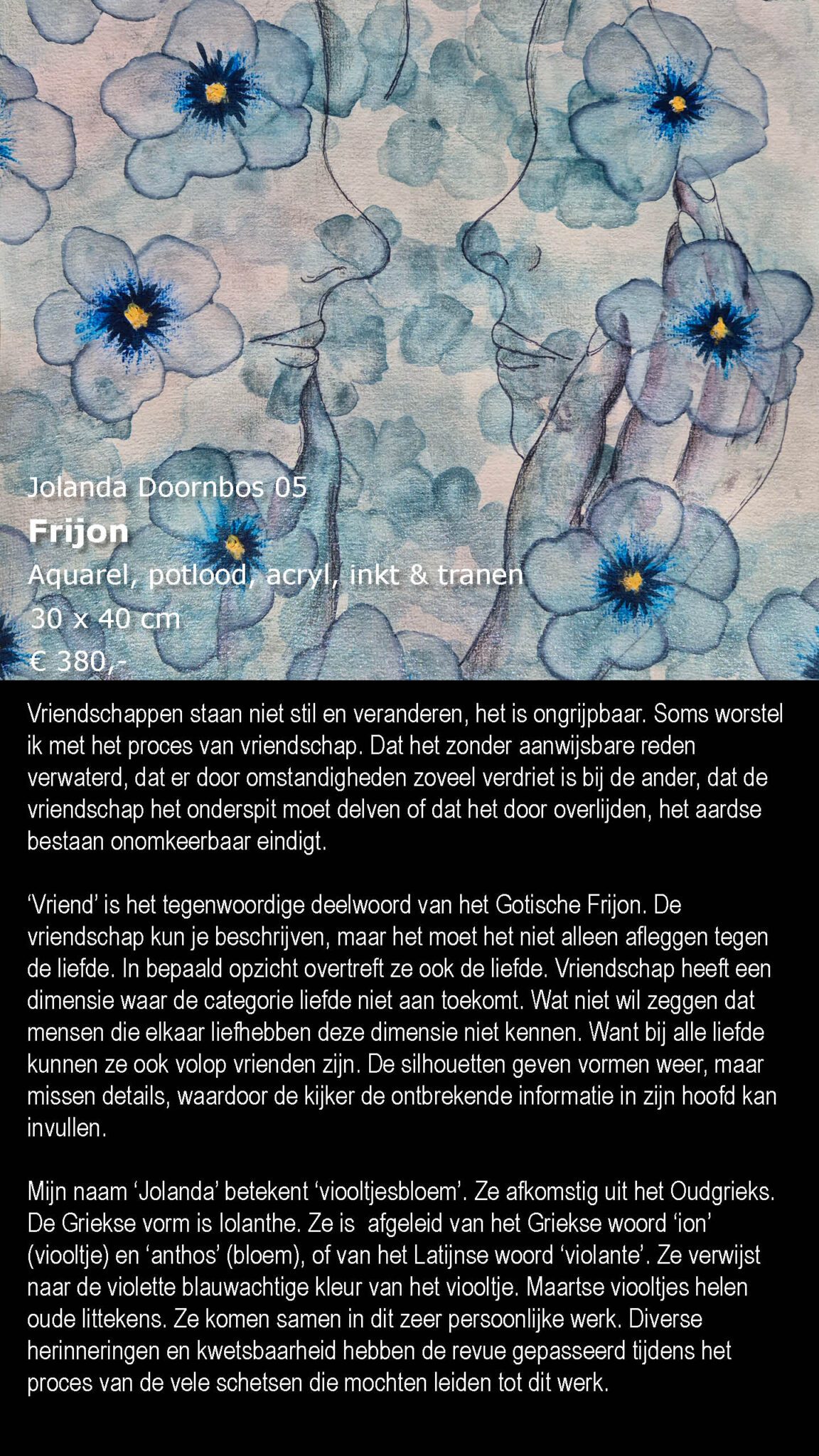 Geboren in Rotterdam (1983) en heeft opleiding ArtEZ docent fine arts afgerond in 2014 en een lasdiploma. Jolanda is docent en haar werk kenmerkt zich door creativiteit en het vertellen van verhalen in de breedste zin van het woord waarin zij zich laat inspireren door haar levensverhaal waarin zij als enig kind is opgegroeid met twee verstandelijk beperkte ouders. Ze schrijft, maakt tekeningen en design objecten en sieraden van hout gecombineerd met metaal. Haar verhaaltjes in de objecten komen vooral naar voren in het hergebruiken van materiaal of bomen die rijp waren voor de versnipperaar. Het terugkerende thema: Het oude is voorbij gegaan, omarm het en geef het door.