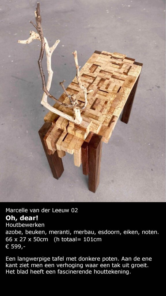 Met hout werken doe ik nog steeds. Zie: https://hetbladvandebomen.exto.nl Naast het maken van kunstzinnige tafels van afvalhout houd ik mij bezig met het ontwerpen en vervaardigen van houten sieraden. Zie sieradenvanhout.nl
