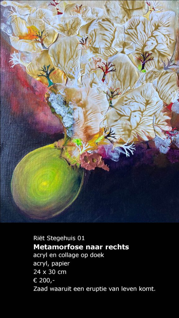 In 1988 afgestudeerd als illustrator aan de AKI Enschede, in 2008 als docent beeldende kunst aan ArtEZ Zwolle. Ik geef teken- en schilderlessen in verschillende technieken aan diverse groepen, in mijn eigen atelier bij Palet, bij schildergroep Bellingeweer Dalfsen en Cultuurkust Harderwijk.