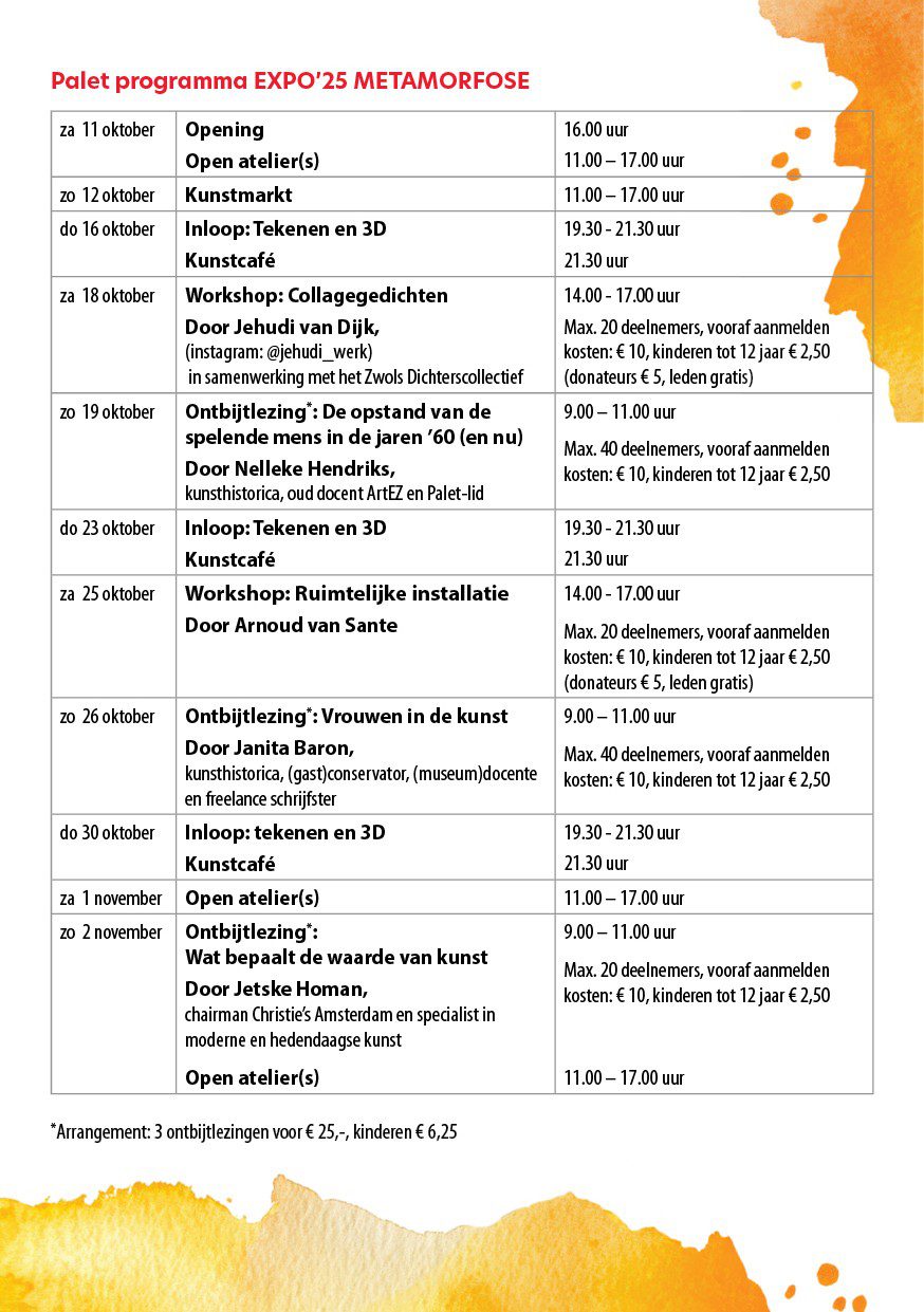 Van 11 oktober tot en met 2 november 2025 opent Kunstenaarsvereniging Palet haar deuren voor de jaarlijkse ledenexpositie aan de Bagijneweide 15 in Zwolle. Het thema is METAMORFOSE – een ode aan verandering, groei en vernieuwing.